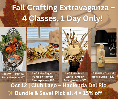 Join us on Sunday, October 12th at Club Lago – Hacienda Del Rio for a fun-filled day of creativity! Each class is about an hour long, all supplies are included, and you’ll leave with something beautiful for your home (or to gift 🎁).